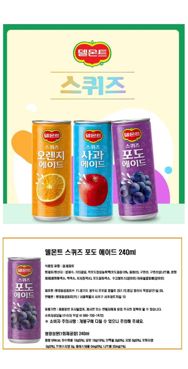 롯데칠성)스퀴즈 포도에이드 240캔@